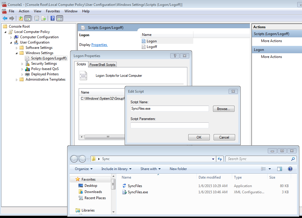 Once you have the utility configured you can execute the file by running SyncFiles.exe to test the results. You need to keep the SyncFiles.exe and the SyncFiles.exe.config file in the same directory. You can call the utility using an existing logon script or you can set the file directly as a logon script as shown below.