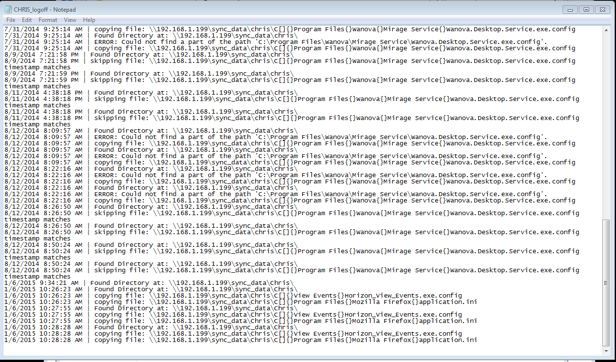 I actually wrote this utility a few months ago, but it was very useful for the customer I developed it for so I wanted to share it. This utility was developed because a customer of mine was looking at going to VDI, but they application they used wrote configuration data into locations outside of the user profile which would be replicated with a tool like VMware Persona Management. It can be used to sync files both on logon and logoff. It also logs all activity for troubleshooting. This utility can be very useful anytime files not located in the user profile need to be synced or even if only specific files in user profile need to be synced. It will work with any VDI or Published Application solution.