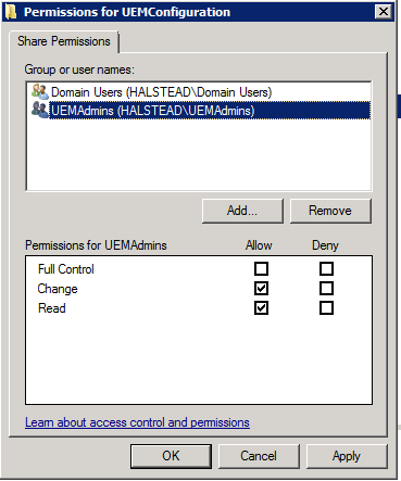 UEM Configuration Share –  This share contains all of the configuration data for UEM.  Administrators will need to be able to read and write to this share and users will need to be able to read from it.   The share can be any standard CIFS share.   DFS namespaces are supported as well for use across a WAN.     The space required on this share is very low  – 1GB of space is typically sufficient.