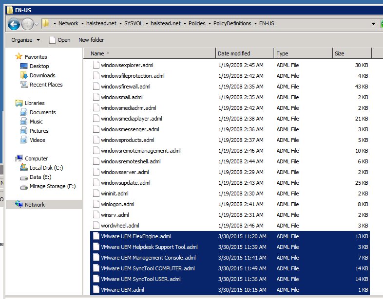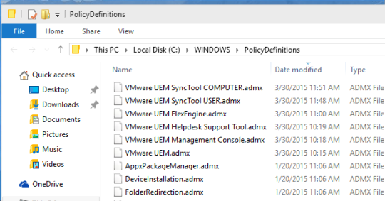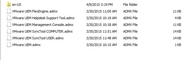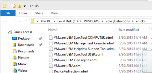 Now that we have our UEM file shares created we can import the ADMX files required for UEM.  As I mentioned earlier, UEM relies on Microsoft Group Policy to apply and save settings.   The templates are provided as ADMX files which must be installed into the central Active Directory policy store.   There are six .admx and corresponding .adml files located in the installation files “Administrative Templates (ADMX)” folder.