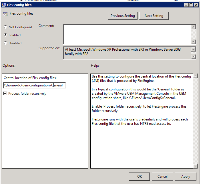 Flex Config Files:  Double-Click the Flex Config Files setting to modify it.   Select “Enabled” then specify the path to the configuration share you created earlier.  Add a “General” Folder at the end of your file share path.   This is where UEM will create the configuration files.   Check the “Process folder recursively” box.   This allows UEM to read all of the sub-folders in the configuration share.   If you wanted certain users to only see specific settings you could restrict them to a single folder by leaving this box unchecked.