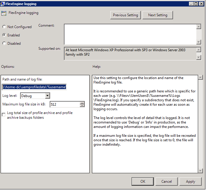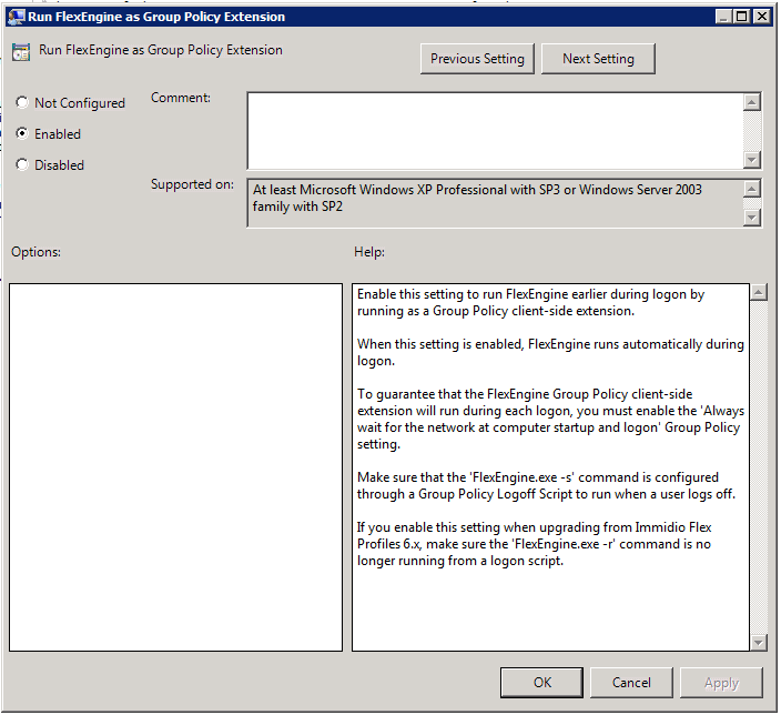 Run FlexEngine as a Group Policy Extension:  Edit this setting and choose “Enabled”.   This is essentially the on/off switch for applying settings with VMware UEM.  If this setting is not enabled so settings will be applied on logon.