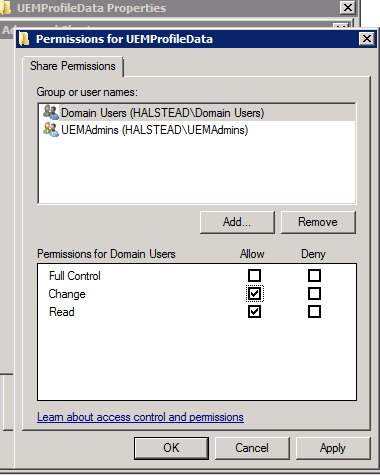 UEM Profile Archive Share – This share is used to store the personal settings for each user. A folder is created for each user under this share.   Settings are read from this share and applied at logon or application launch (DirectFlex) and saved on logoff or application exit. Just like the configuration share, this is just a standard CIFS share and DFS namespaces are supported.   The space required will depend on what type of data is being captured by UEM, but 100mb per user is a good number for planning purposes.