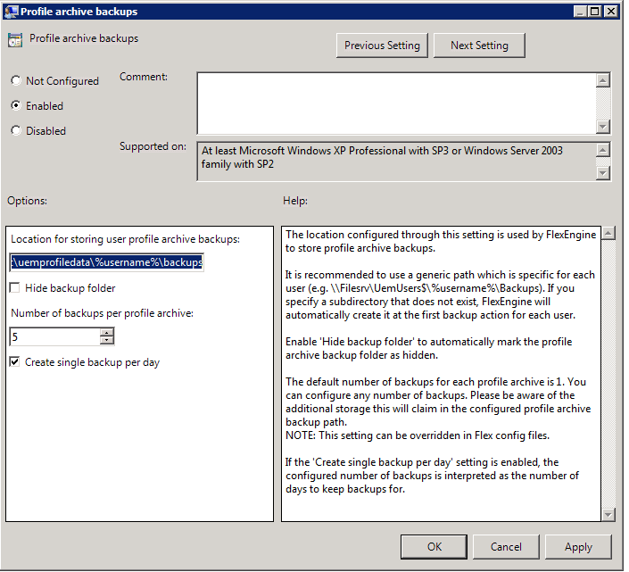 Profile Archive Backups:  This settings is used to maintain backup copies of the user settings which can be restored via self-service or via the help desk.  Select “Enabled” and then type the path to the user profile archive share appended with \%username%\backups.  Change the “Number of Backups per profile archive” to “5” and check the “Create single backup per day box.  Click OK.