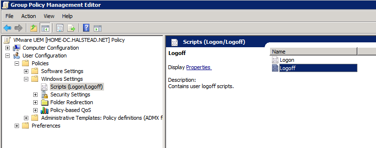 Browse to “User Configuration | Polices | Windows Settings | Scripts (Logon/Logoff), and double-click the “Logoff” setting.