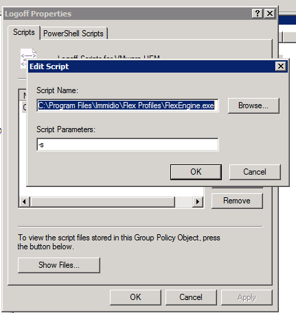 Set Logoff Script: We need to set a logoff script to ensure that all user settings are written out at logoff.   It is done through a logoff script as there is no way to process actions on a logoff in Group Policy currently.  This script will run the VMware UEM agent with a -s switch to save user settings on logoff.