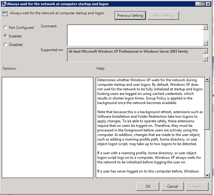 Always wait for the network at computer startup and logon – This setting ensures that the VMware UEM GPO settings will apply when the user logs into the system.