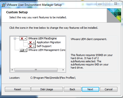 Select the “Custom” setup type and right-click “VMware UEM FlexEngine” and choose to NOT install on this computer.   Right-Click VMware UEM Management Console and choose to install on this computer.