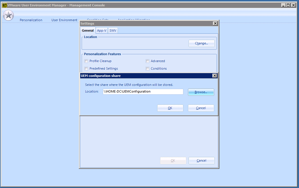 When you launch the VMware UEM Management Console the first time, it will prompt for a location of the UEM Configuration Share.   This is the share we setup earlier – specify the share name and click OK