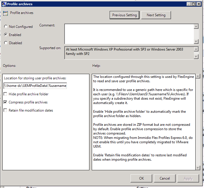 Profile Archives:  This is the share you created earlier where the user settings will be stored.  A subfolder will be created for each user.   Select “Enabled” then enter the path to the user profile archive share appended with %username%\archives.  Check the “Compress profile archives” box.  This will .zip up the configuration data to save space.