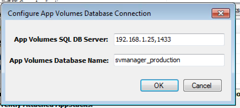 The application is written in VB.NET 2013. When first launching the application, if no SQL connection has been established it will prompt the user to enter the address and name of the App Volumes database. The application runs under the security context of the user launching the application, so that user must have at least read access to the database.