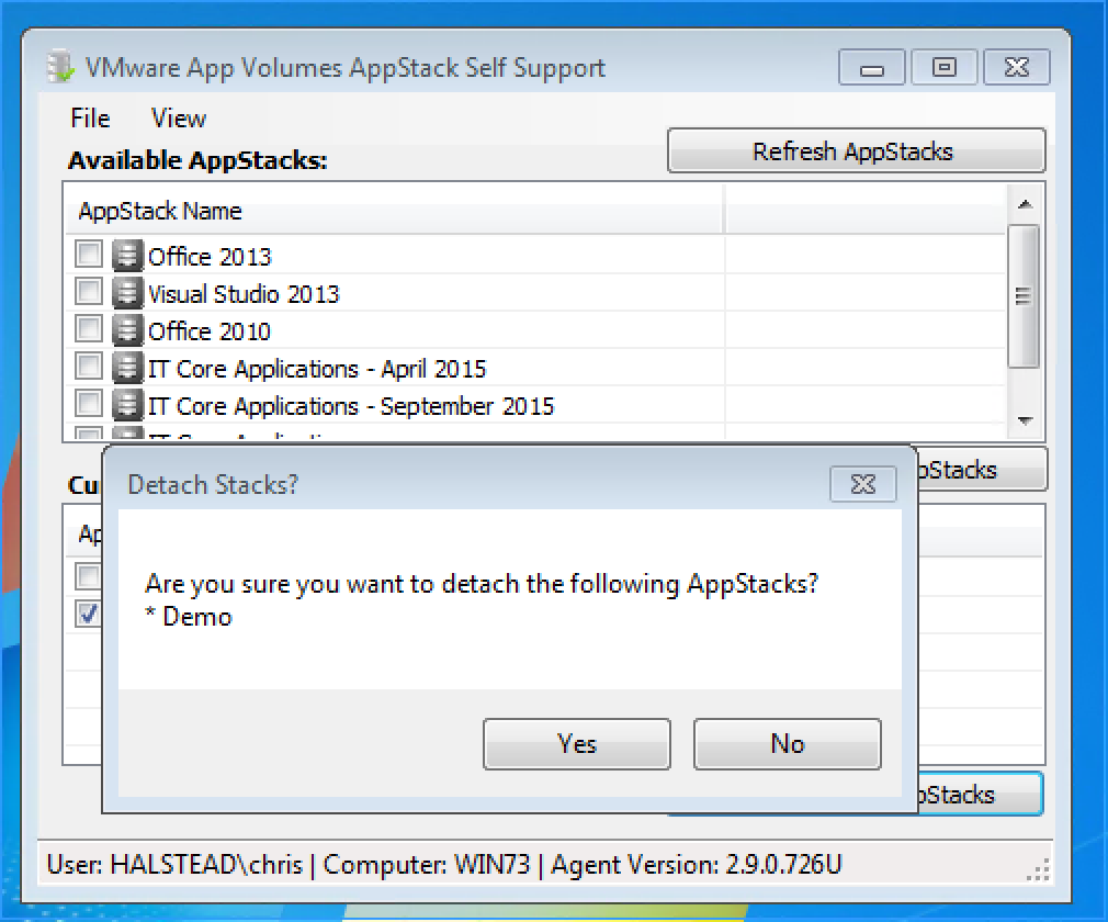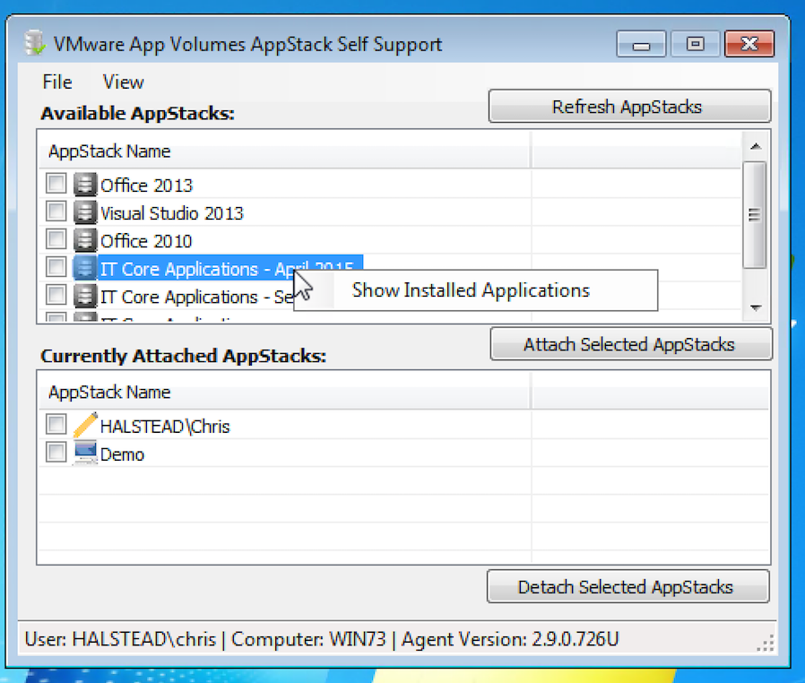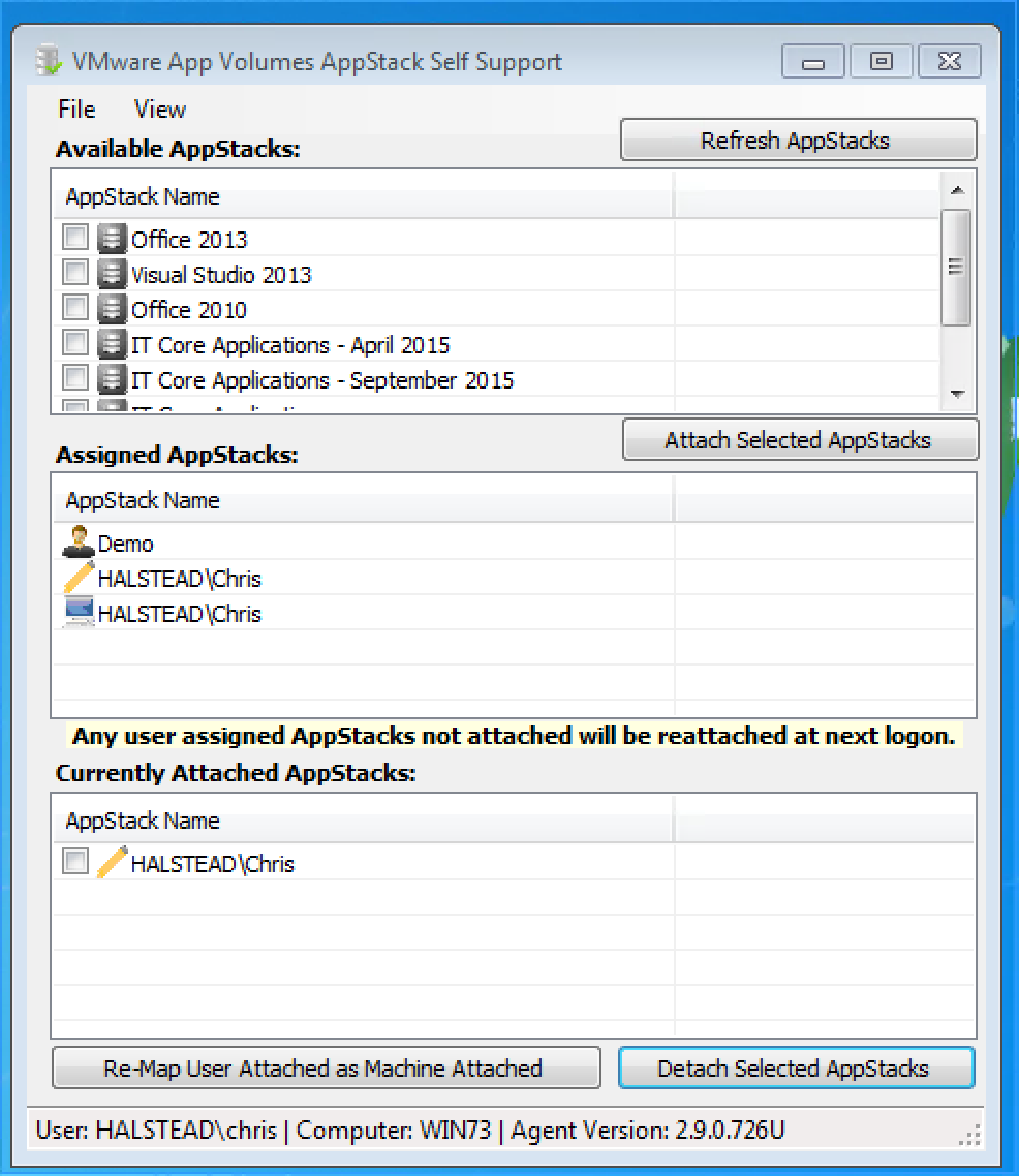 When the user clicks the “Refresh AppStacks” button, the application connects to the App Volumes database and filters AppStacks by OS and Architecture and provides the user a list. It also queries the database for an assignments for the current user or computer and will display those along with any currently attached AppStacks.