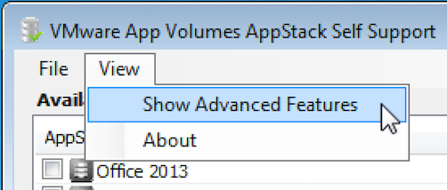 The user can also remove AppStacks on demand and any current or pending Assignments are visible through an Advanced View. There are also switches that can be used with a solution such as VMware UEM. The user can also right-click an AppStack to see what applications are installed in the AppStack prior to attaching it.